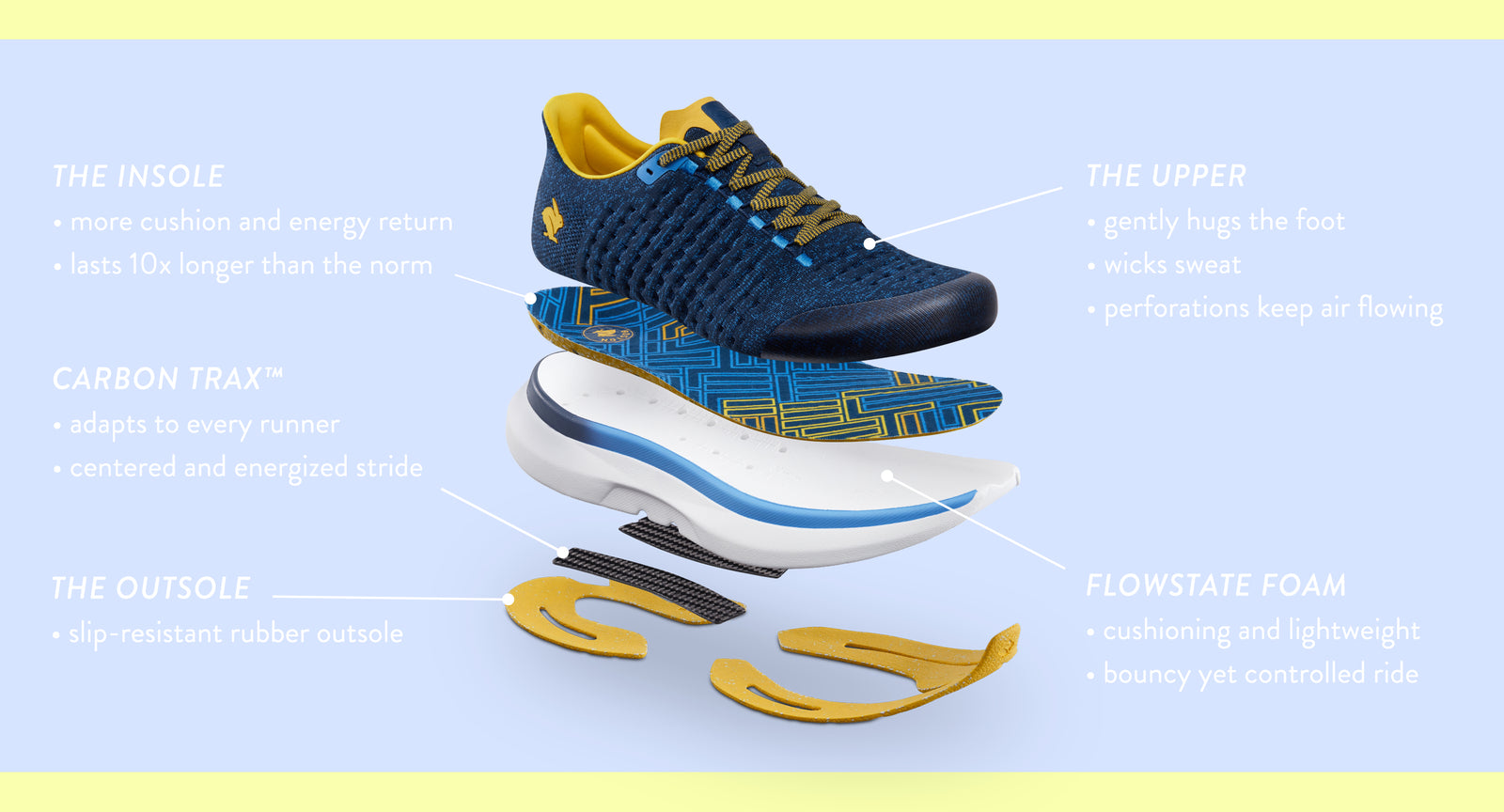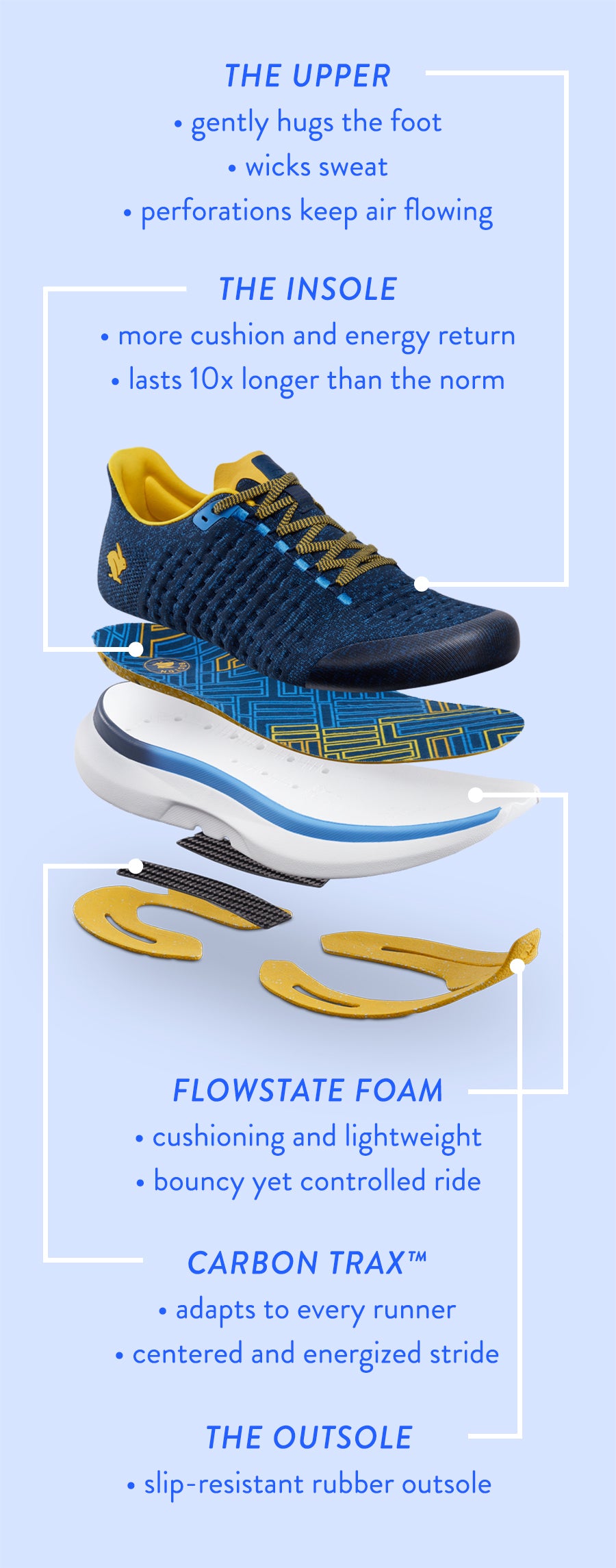 Engineered from the inside out, our shoe features contouredblumaka insoles made from 85% recycled ETPU—that’s midsole-grade foam. Expect more cushion and energy return than the norm. To be exact, these insoles are guaranteed to last 10x longer than competitors.